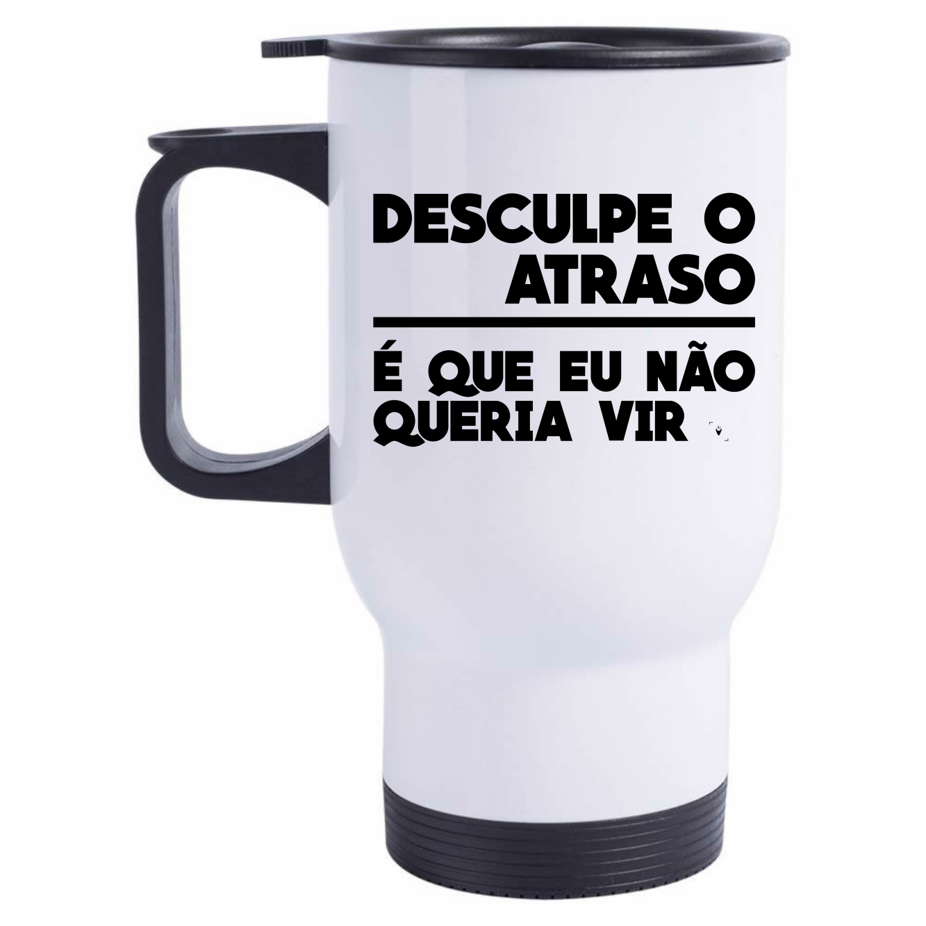 A caneca possui estampa nos dois lados, sendo um o Programador e o outro a estampa "Desculpe o atraso, é que eu não queria vir"